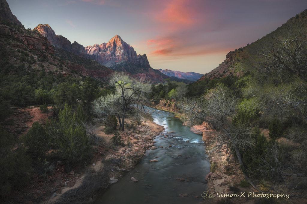 Thanks for visiting and leaving comments. More details on my new website: https://simonxuphotography.smugmug.com/ ------------------------------------------------------------------------------------------------ First light on the Watchman Tower and Virgin River.