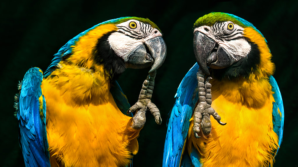 Blue Gold Parakeet couple in self grooming and animated conversation.