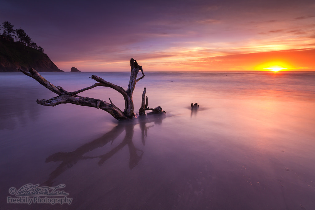 This is a long exposure of a dead tree with Oregon coast sunset.