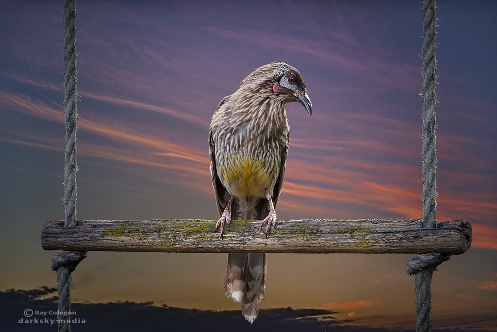 A watchful Wattlebird scanning for movement that might hold the promise of an evening snack.