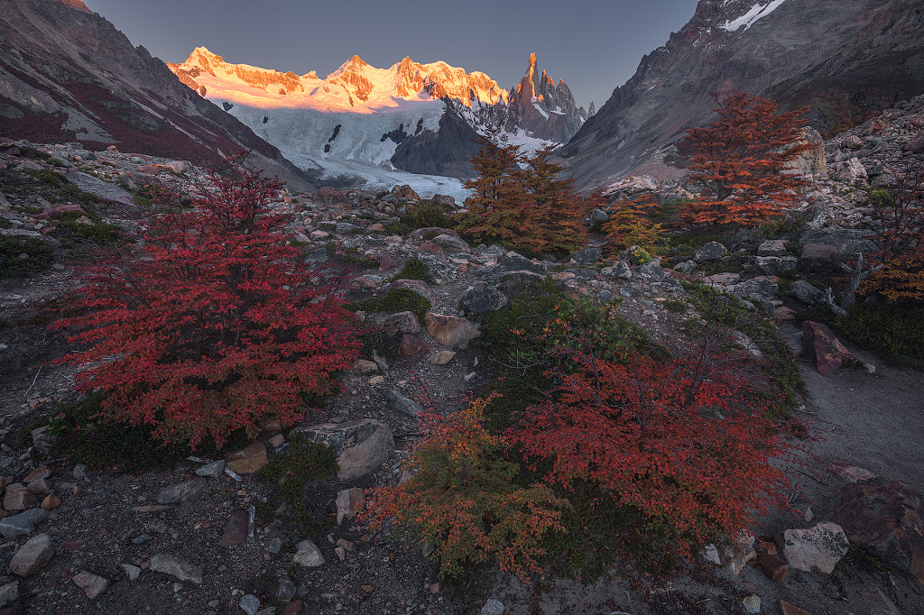 Blazing alpenglow on the peaks of Monte Fitz Roy, surrounded by beautiful autumn foliage.