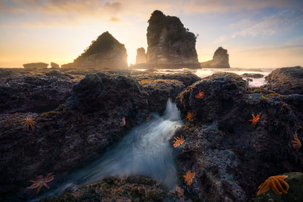 On this afternoon, the tide withdrew and the swell was unusually calm, as the sun made its descent into the sea. The hardy reef star, or Pātangaroa, flourishes on the exposed west coast reef in the fading light.