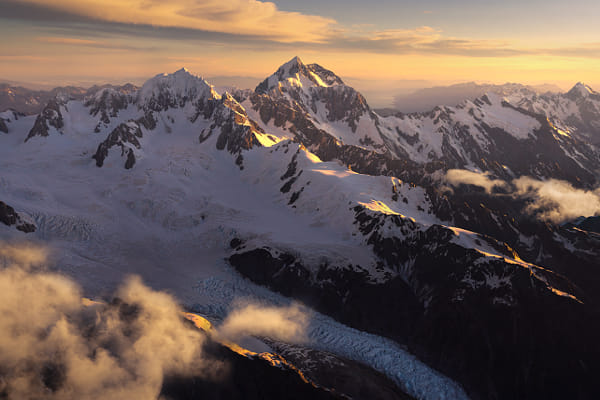 The highest of heights in New Zealand, Mount Cook (Aoraki) and Tasman (Horokoau) draped in gold, as the sun sets off the west coast one calm summers evening.