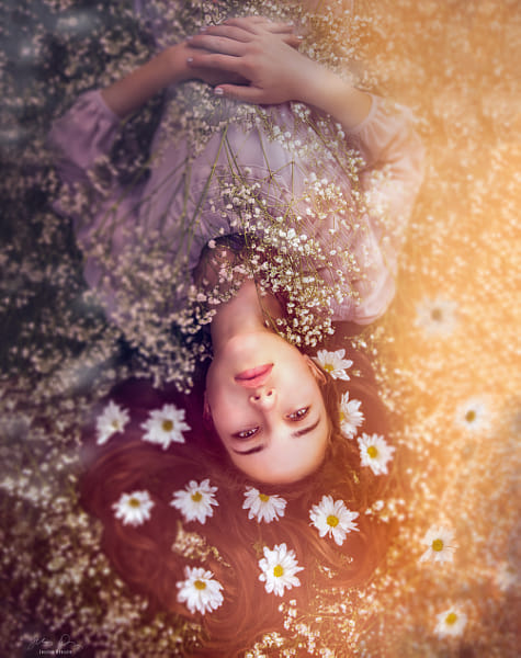Dreamy portrait with flowers and patterning. Fantasy portraiture inspired by paintings.