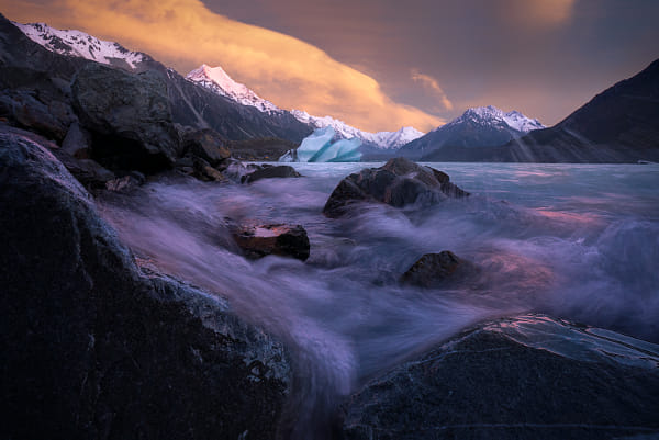 Strong winds and rain rapidly approach, as the light of dawn ignites the looming cloud above the ancient glaciated landscape of the Southern Alps.