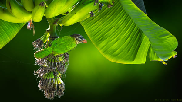 Greenhorn ! A juvenile brown headed Barbet explores the Banana plantation in my neighborhood. A slice of nature glowing green in the morning Sun.