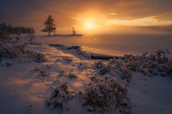 Ringerike, Norway. Frost smoke diffused the light from the setting sun.