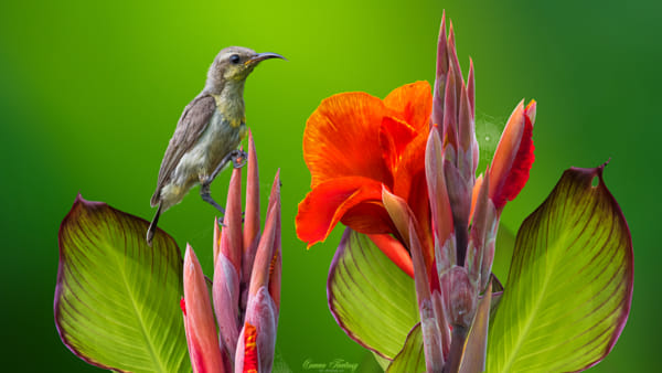 A Canna Fantasy Spring is the season and perched on the spikes of Canna indica bud is the little female purple sun bird. A nectar hunter in pursuit. If you are reading this and wondering how, here is the little secret. Well, the stage is all set beforehand. Isolating and positioning the best canna flowers in the garden with the green studio cloth behind. Hidden Camera mounted on tripod !. And now, the long wait begins !. Eventually the little girl would come seeking. And this is the prize !