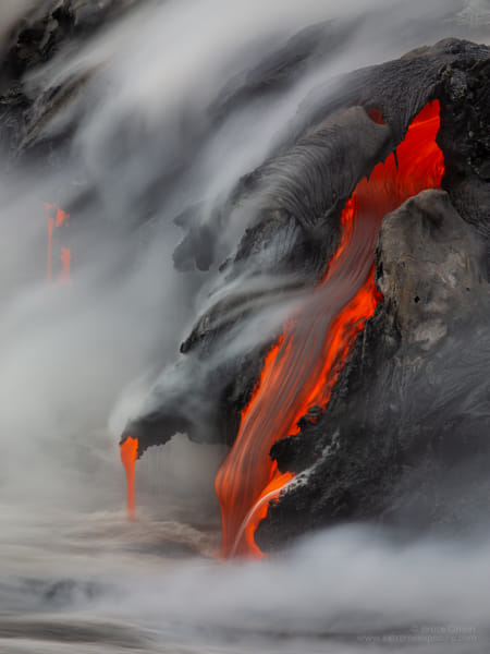 Molten lava cascades into the sea within the Hawai‘i Volcanoes National Park, creating a steamy, surreal scene as the island's coastline is forever altered.