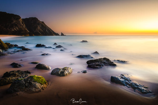 I was walking by the sea as I prepared to watch another sunset. There were no clouds in the sky, so the sun occupied all the light. And it may be just me imagining it, but in the background, I saw two Elephants drinking water while a shark showed its fin in a threatening way! Was it just imagination ?? At Praia da Adraga we can find several dark rocks, which give it its own personality, combining the mountain landscape with the beach landscape. Fantastic to visit!