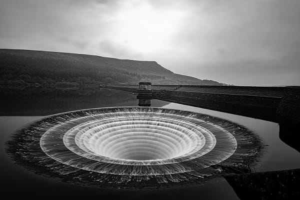 One of the giant overflow 'plugholes' in Ladybower Reservoir which allows excess water from the Reservoir to flow downstream through the River Derwent. At this time of year Ladybower Reservoir is very low, but this image, taken after heavy rainfall in November 2019, shows a different scene.