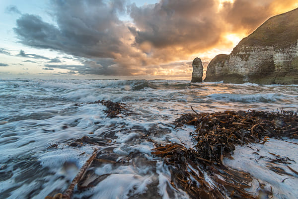 A dramatic sunrise over the sea stack and cliffs of Selwicks Bay, Flamborough, East Yorkshire.