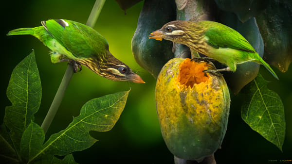 This ripe papaya fruit is an irresistible temptation for the Barbets. No etiquette, no table manners, just the pleasure of wooing the taste buds. A page filled with hues from the book of nature !