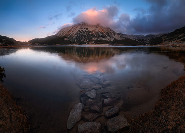 Todorka peak, coved by clouds. View from Muratovo lake. Pirin mountain, Bulgaria.