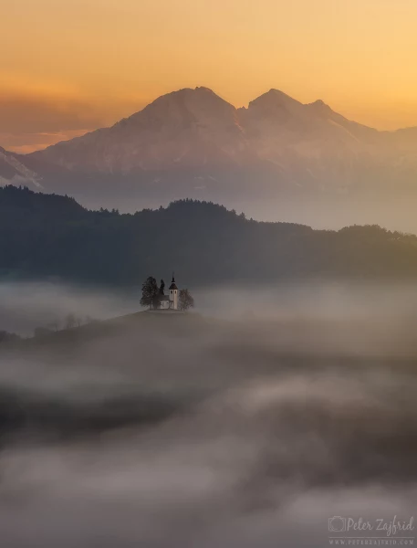 Foggy autumn morning at St. Thomas church, Slovenija