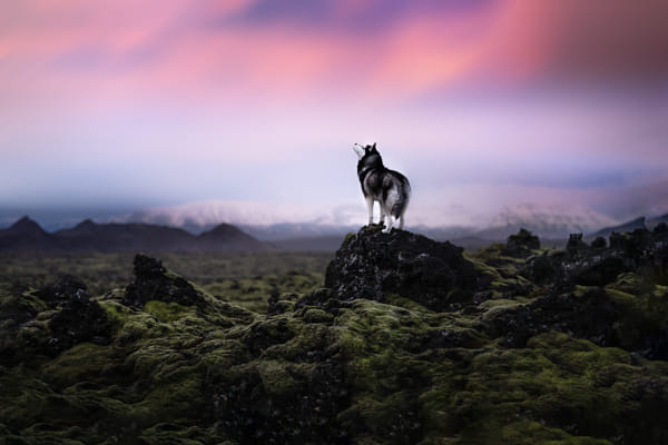 Siberian Husky and Sunrise at Iceland's Lava Fields Covered with Moss