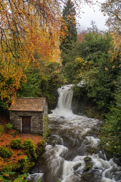 Rydal Falls and Grot at Rydal Hall, in the English Lake District.