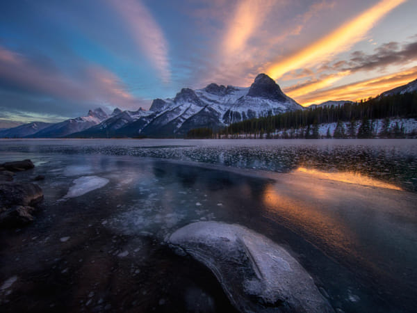 现在是拍摄落基山冬景的好时机,湖边已开始结冰,但是整个湖还没有完全冻上,冰与雪在其中变幻无穷,再加上雪山,云霞和倒影,真是美不胜收。