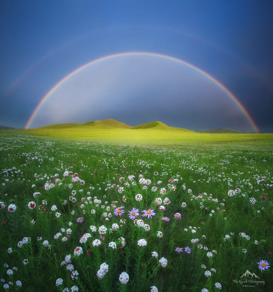 《彩虹下的花海》夏天有温柔的风和浪漫的黄昏,这是我见过最浪漫的黄昏之一了。夏天草原上不仅开满了野花、还有它那变幻莫测的天气。草原上的天气,对于我们风光摄影师来说就像是一个个摄影【盲盒】,上一秒晴空万里,下一秒可能就是一场倾盆大雨。在这里,你一天可能会遇到几次彩虹。(曾经我一天内见过6次彩虹🌈)这也是我喜欢草原上的原因之一。你看草原上这几朵紫菀在众多狼毒花的簇拥下显得有些羞涩-就想你一样。行走在路上的阿卡Carson。