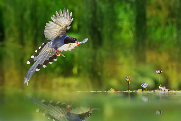 Low level flying of lotus pond | 荷花池低空飛行 You can find Fuyi (富益) on: https://www.flickr.com/people/fuyi/ My Facebook Page: https://www.facebook.com/fuyi.chen.9 鳥類名稱 Bird Name:台灣藍鵲、長尾山娘 / ヤマムスメ / Taiwan Blue Magpie.(Endemic Birds of Taiwan|台灣特有鳥). 學名 Scientific Name: Urocissa Caerulea Gould. 科名 Family:鴉科(Corcidae). 圖像大小 Image Size : 6000 x 4000 pixel