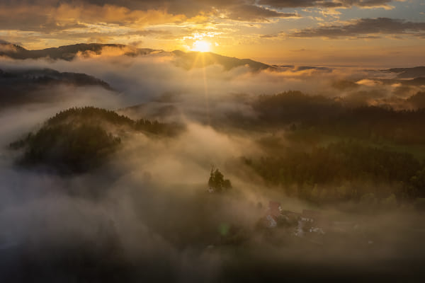 Foggy spring sunrise in Lovrenc na Pohorju, Slovenija